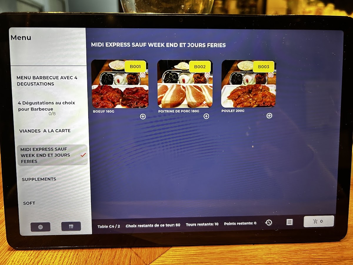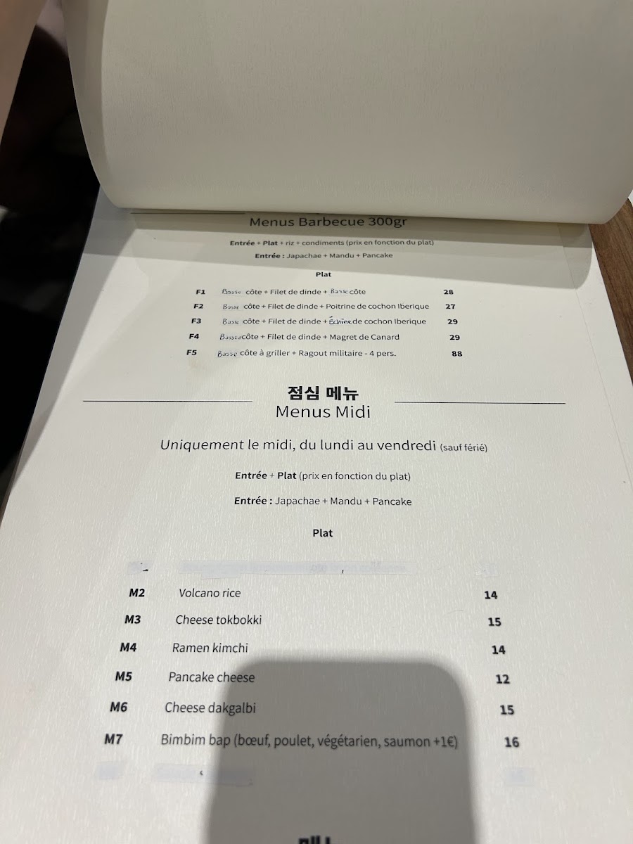 The menu at Séoul Grill features a variety of Korean cuisines, focusing on Korean barbecue and hot pot dishes. Diners can explore selections such as Cheese Dakgalbi, Barbecue Canard, Bibimbap with beef, and assorted barbecue platters including the BBQ Coréen F2 with entrecôte, turkey, and pork belly. The offerings are organized primarily around grilled meats and traditional Korean main courses.